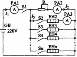 对于低电压直流电源也采用同样的方法,只是电热丝、闸刀的数量要多一些。对于超大容量的蓄电池放电而无直流电流表指示总电流时,应在电热丝支路中串接PA3。这样总电流就等于n×I3+I2(n为合上的电热丝EH的回路数,I3是通过电热丝