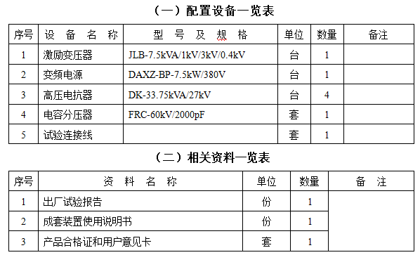 结论:串联谐振装置容量定为135kVA/54kV,分四节电抗器,电抗器单节为33.75kVA/27kV/1.25A/100H通过组合使用能满足上述被试品的试验要求。