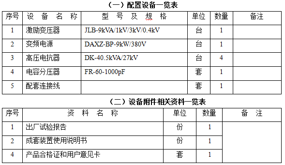 五、 串联谐振装置容量及试验关系列表