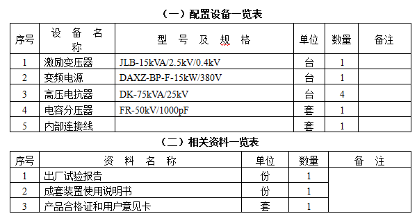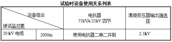 结论:串联谐振装置容量定为300kVA/50kV,分四节电抗器,电抗器单节为75kVA/25kV/3A/43H通过组合使用能满足上述被试品的试验要求。