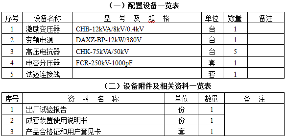 结论:串联谐振装置容量定为375kVA/250kV;分五节电抗器,电抗器单节为75kVA/50kV/1.5A/170H通过组合使用能满足上述被试品的试验要求。
