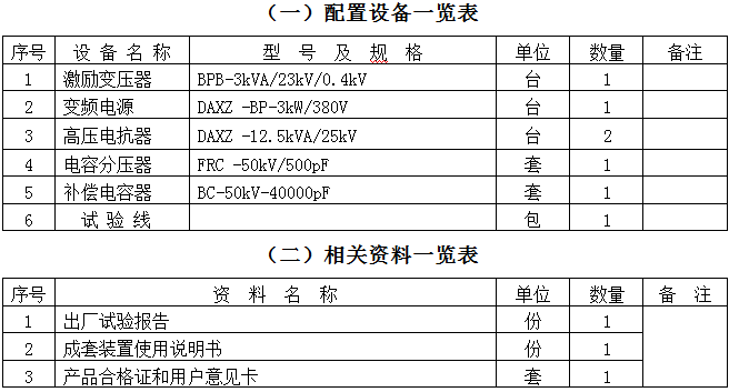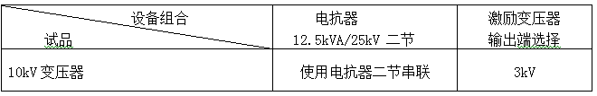 串联谐振装置容量定为25kV/50kV,分二节电抗器,电抗器单节12.5kVA/25kV/0.5A/80H通过组合使用能满足上述被试品的试验要求。