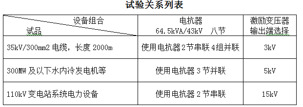 出口电压15kV以下的300MW及以下水内冷发电机,氢冷发电机及150MW空冷发电机的交流耐压试验,试验频率45~65HZ,电容量≤0.35μF,试验电压不超过33kV。