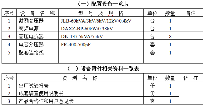 串联谐振装置容量定为1100kVA/440kV;220kV;55kV分八节电抗器,电抗器单节为137.5kVA/55kV/2.5A/120H通过组合使用能满足上述被试品的试验要求。