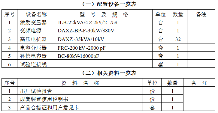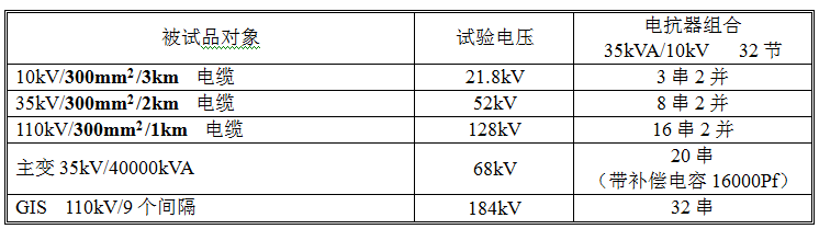 结论:串联谐振装置容量定为1120kVA/320kV,10kV,分32节电抗器,电抗器单节为35kVA/10kV/3.5A/9H通过组合使用能满足上述被试品的试验要求。