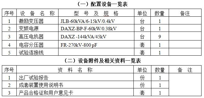 1、110kV/300mm2 ,长度2000m电缆的交流耐压试验,电容量≤0.294uF,试验电压128kV。2、110kV变压器、开关等设备的交流耐压试验,试验频率30-300Hz,试验电压不超过265kV。