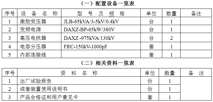 结论:串联谐振装置容量定为1950kVA/150kV,分二节电抗器,电抗器单节为975kVA/150kV/6.5A/100H通过组合使用能满足上述被试品的试验要求。