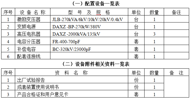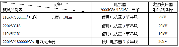 串联谐振装置容量定为6000kVA/405KV,分三节电抗器,电抗器单节为2000kVA/135kV/14.8A/42H通过组合使用能满足上述被试品的试验要求。