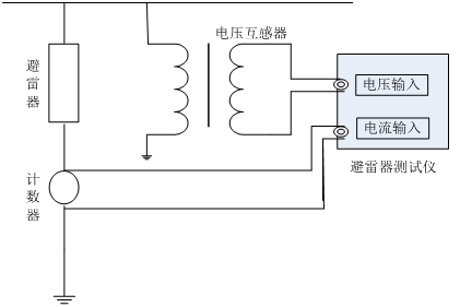 本方法需配可调交流高压电源,电压信号输入接到试验变压器的测量仪表端,氧化锌避雷器一端接高压,另一端经一保护器接地,与仪器的地和高压电源地在联接在一起。交流电流信号输入端接到避雷器的下端和地。