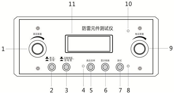 将压敏电阻与仪器连接,按下“高压启停”键,开启高压后按下“测试”键,显示屏立即显示的是被测压敏电阻的击穿电压(U1mA),单位为“V”,约2秒钟后显示屏自动显示漏电流(I0.75U1mA),单位为“μA” ,绿色指示灯随漏流显示同步点亮,持续约2秒后自行消失。操作人员应采取必要的高压防护措施,以免高压电击伤人。