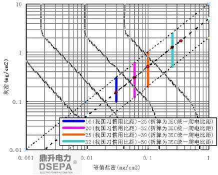 新的污秽等级划分方法引入了等值盐密和灰密双重因素。下图以参照盘形绝缘子(结果高度146mm,盘径255mm,爬距305mm)等值盐密及灰密和现场污秽度的相互关系。四条粗线分别为非常轻污秽区(a区)、轻污秽区(b区)、中等污秽区(c区)、重污秽区(d区)和非常污秽区(e区)的分界线,分界线表明同一耐受压下现场污秽度可以有不同等值盐密和灰密的组合。根据我国电网的大量污秽测量数据,灰密为等值盐密的2~10倍,平均可取等值盐密的5倍。